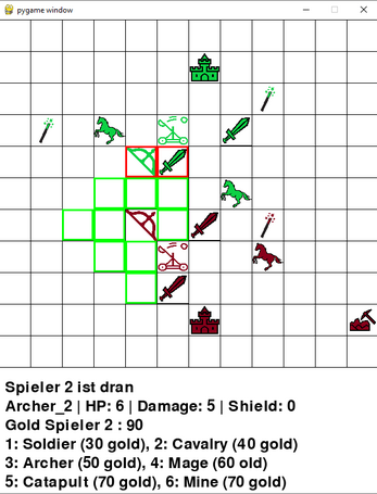Choose from different unit types (Soldiers, Archers, Cavalry, Mages, Catapults, Mines) and plan your moves strategically.